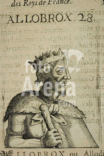 akg5822840 Allobrox, legendary celtic king (16th king of the Gauls), became king in 1513 BC and reigned for 68 years. - "ALLOBROX". - - No. 28 from a portrait series of a partly mythical genealogical tree of the kings of France, starting with the biblical forefather Adam and ending with King Louis XIII. Copper engraving, anonymous. From: Thomas Blaise (1578-1654), Histoire généalogique des Roys de France depuis la création du monde jusques à présent, enrichie de leurs portraits (...), Le tout extraicte de l'histoire Universelle de Jacques de Charron, Paris (Thomas Blaise) 1630, p. 55. Private collection.