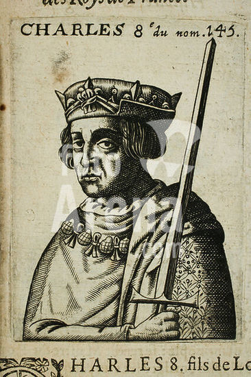 akg5822955 Charles VIII, the Affable (Charles VIII l'Affable), King of France (1483-1498); Amboise 30. 6. 1470 - ibid. 7. 4. 1498. - "CHARLES 8e du nom". - No. 145 from a portrait series of a partly mythical genealogical tree of the kings of France, starting with the biblical forefather Adam and ending with King Louis XIII. Copper engraving, anonymous. From: Thomas Blaise (1578-1654), Histoire généalogique des Roys de France depuis la création du monde jusques à présent, enrichie de leurs portraits (...), Le tout extraicte de l'histoire Universelle de Jacques de Charron, Paris (Thomas Blaise) 1630. Private collection.