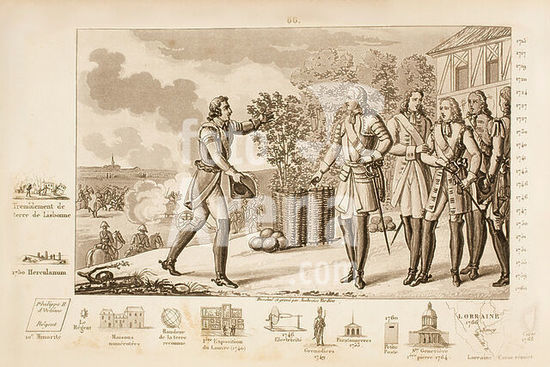 akg5836277 Louis, King of France (1715-1774); Versailles 15. 2. 1710 - ibid. 10. 5. 1774. - "LOUIS XV / (...) Le roi et le dauphin assistèrent a la bataille de Fontenoi". - (Waf of Austrian Succession 1740-48, Battle of Fontenoy on May 11, 1745. Victory of the French under Maurice of Saxony over the Pragmatic Army under Wilhelm August, Duke of Cumberland. King Louis XV and his son, the Dauphin Louis Ferdinand (1729-1765), refuse to retreat from the danger of being hit by enemy cannons.). Stipple engraving by Ambroise Tardieu (1788-1841). From: (Louis-Samuel) Colart, Histoire de France représentée par tableaux synoptiques et par 70 gravures, employée pour l'éducation des enfans de France, Paris (Ch. Gosselin, Bossange père, Jules Renouard) (1825), Plate 66, Private collection.