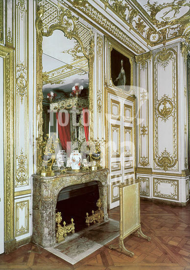 akg931099 Versailles (Frankreich), Schloss /. Château de V., Appartement intérieur du roi, Nouvelle Chambre (Neues Schlafzimmer; Schlafzimmer Ludwigs XV.; eingerichtet 1738; Boiserien Entwurf v. J.A.Gabriel, Ausführung J.Verberckt). Teilansicht der Westwand mit Kamin und Scheintüre. Foto, undatiert.