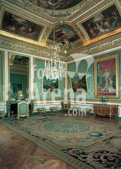 akg940560 Versailles (Frankreich), Schloss, Grand Appartement de la Reine, Pièce des Nobles (Adelssalon; Decke 1671 von Michel Corneille; Neudekoration 1785 für Marie-Antoinette durch R.Mique). Innenansicht nach Nordwesten; an der Nordwand Porträt Ludwigs XV. (Tapisserie, 1770, von P.F.Cozette nach M.Van Loo). Foto, undatiert.