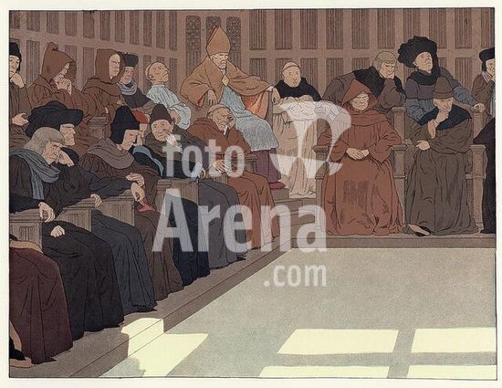 akg4074024 Jeanne d'Arc (Johanna von Orléans, Jungfrau von Orléans); französische Nationalheldin, Heilige und Märtyrerin; Domrémy, Lothringen, vermutlich 6. 1. 1412 - (hingerichtet) Rouen 30. 5. 1431. - "Vous dites que vous êtes mes juges, avisez bien à ce que vous faites, car vraiment je suis envoyée de Dieur et vous vou mettez en grand danger!" - (Jeanne d'Arc vor dem Inquisitionstribunal in Rouen unter Vorsitz des Bischofs von Beauvais, Pierre Cauchon, 21. Februar ff.). Linker Teil der doppelseitigen Darstellung. Farbdruck nach Zeichnung von Louis-Maurice Boutet de Monvel (1850-1913). Aus: Jeanne d'Arc, par M. Boutet de Monvel, Paris (Plon-Nourrit & Cie) 1896, S. 44. Privatsammlung. Museum: PRIVATE COLLECTION.