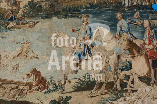akg5749507 Louis (Louis) XV, King of France (1715-74); 1710-1774. - "La Mort du cerf aux étangs de Saint-Jean-aux-Bois, Forêt de Compiègne" (The death of the deer in the ponds of Saint-Jean-aux-Bois in the forest of Compiègne). - Detail: King Louis XV, followed by his uncle Louis-Alexandre de Bourbon, Comte de Toulouse. Tapestry, Paris, Manufacture royale des tapisseries, Michel Audran, 1736/38, after carton, 1736, by Jean-Baptiste Oudry (1686-1755). No. 2 of the nine-part series "Les chasses royales de Louis XV" (The Court Hunts of King Louis XV). Wool, 424 × 501 cm. Inv. No. 610. Florence, Palazzo Pitti.