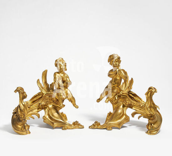 akg8298139 PAIR OF LARGE ANDIRONS WITH PUTTI WITH INSTRUMENTS STYLE LOUIS XV. France. Late 19th century. Gilt bronze. Iron supports on the back. 35x33x22cm. Condition: Good condition with partly somewhat stronger, age-typical signs of use. Gilding partly soiled and partly rubbed. Pipe of the bagpipe of one putto broken and lost.
