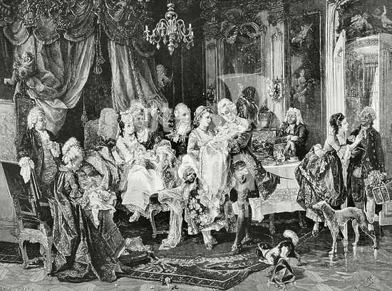alb4313309 18th-century European society. Return from the christening. Scene of aristocratic customs at the time of Louis XV. The christening party has just returned from the parish church. The nurse presents the newborn to the guests. Engraving by Walla after a painting by Carl Herpfer (1836-1937). La Ilustración Española y Americana (The Spanish and American Illustration), January 15, 1884.