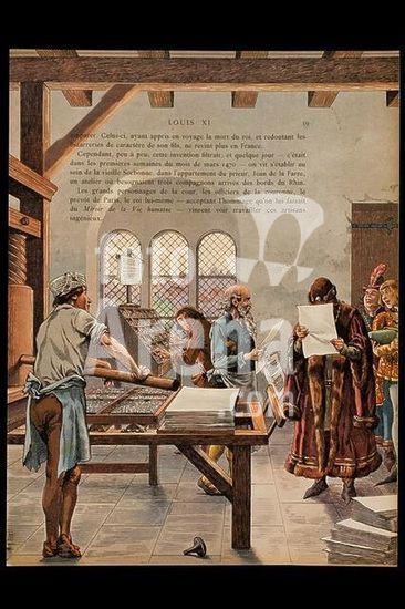 akg1938362 Louis XI, King of France (1461-83); 1423-1483. Louis XI visits the book-printing workshop of Jean de la Farre at the Sorbonne in Paris, 1470. Colour lithograph after a watercolour by Job, full name Jacques Onfroy de Bréville (1858-1931). From: Job et G. Montorgeuil, Louis XI, Paris (Combet & Cie), 1905, p. 58.