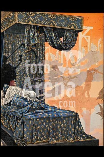 akg1938363 Louis XI, King of France (1461-83); 1423-1483. The terminally ill Ludwig XI is tormented by nightmares. Colour lithograph after a watercolour by Job, full name Jacques Onfroy de Bréville (1858-1931). From: Job et G. Montorgeuil, Louis XI, Paris (Combet & Cie.), 1905, p. 75. Berlin, Sammlung Archiv für Kunst und Geschichte.