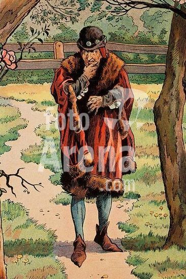 akg1947489 Louis XI, King of France (1461-83); 1423-1483. King Louis XI takes a walk in the gardens of Plessis-les-Tours; hanged on the trees. (Alluding to the harshness Louis employed against his enemies.). Detail. Colour lithograph after a watercolour by Job, full name Jaques Onfroy de Breville (1858-1931). From: Job et G. Montorgeuil, Louis XI, 1905, p. 55.