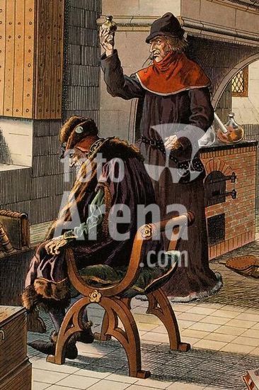 akg1947567 Louis XI, King of France (1461-83); 1423-1483. The terminally ill patient Ludwig XI and his physician Jacques Coitier (Coictier). Colour lithograph after a watercolour by Job, full name Jacques Onfroy de Breville (1858-1931). From: Job et G. Montorgeuil, Louis XI, Paris (Combet & Cie.), 1905, p. 69.
