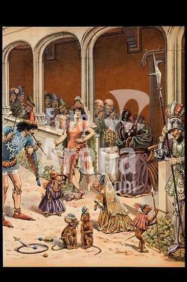 akg1947572 Louis XI, King of France (1461-83); 1423-1483. The terminally ill Louis XI is entertained by a jester and trained animals in Plessis-les-Tours. Colour lithograph after a watercolour by Job, full name Jacques Onfroy de Bréville (1858-1931). From: Job et G. Montorgeuil, Louis XI, Paris (Combet & Cie.), 1905, p. 71.