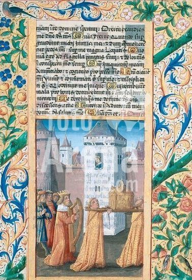 akg316681 Book illumination, France, Bourges and Toulouse (Workshop or circle of Jean Colombe), c. 1490. King David obtains the Ark of the Covenant. From the Book of Hours of Louis of Orléans, later King Louis XII (Horae ad Usum Romanum). On parchment, 215 x 148mm. Lat. Q. v. I, 126, fol. 56 v, St Petersburg, Russian National Library. Museum: St Petersburg, Russian National Library.