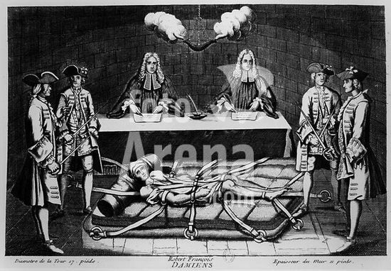 akg323007 Damiens, Robert François known by the murder attempt against King Louis XV of France on 5 January 1757 in Versailles. 1715-1757. The condemnation of Damiens to death by quarters. Contemporary copper engraving. Paris, Bibliothèque Nationale. Museum: Paris, Bibliothèque Nationale.