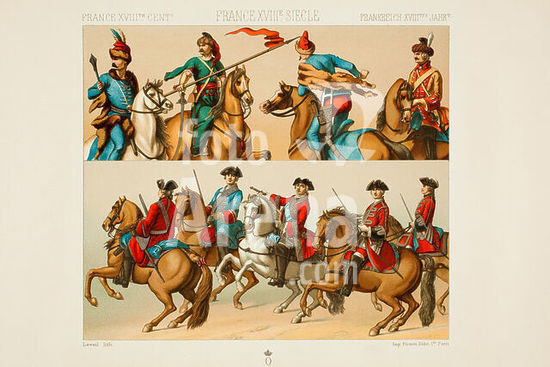 akg5839968 Louis XV, King of France (1715-1774); Versailles 15. 2. 1710 - ibid. 10. 5. 1774. - "FRANCE XVIIIe SIECLE / première Moitie, Le roi, sa maison militaire, cavalerie." - (The king, his military household, cavalry). Color lithograph by Leveil after contemporary representations. Print: Firmin-Didot et Cie., Paris. From: A. Racinet (Auguste Racinet, 1825-1893), Le Costume Historique, Cinq cents planches (...), Types principaux du vêtement et de la parure rapprochés de ceux de l 'intérieur de l'habitation dans tous les temps et chez tous les peuples, avec de nombreux détails sur le mobilier, les armes, les objets usuels, les moyens de transport, etc., Paris (Librairie Firmin-Didot et Cie.) 1888, Volume V, Plate 383. Private collection.