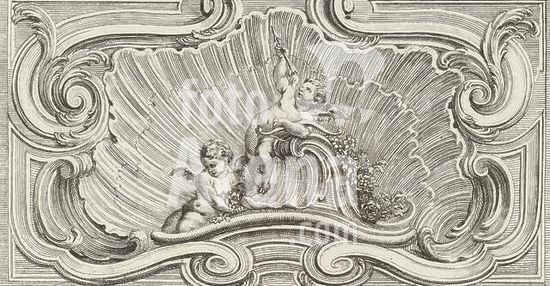 alb15453984 granter of privilege" Louis XV (king of France), Huquier, Gabriel, Paris, Meissonnier, Juste Aurèle, Desplaces, Louis, Oeuvre de Juste Aurele Meissonnier, Panneaux d'ornements rocaille, sept planches, Amor with bow and arrow near a seated amor, In rectangular ornamental border with volutes and foliate tendrils. This print is part of an album., print, album leaf, ornament print, prints, height 118 mm, width 200 mm, French, 1682 - 1739, print maker, printmaker, 1738 - 1749, paper, etching, etchings, Work conception, 1693 - 1750-07-31, after a design by, Publication (Event), Publication, 1695 - 1772-06-11, publisher, 1710-02-15 - 1774-05-10, granter of privilege.