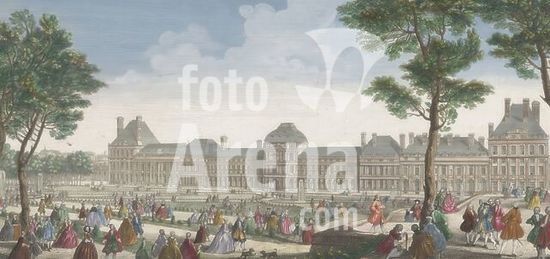 alb15458920 Louis XV (King of France), Rigaud, Jacques, Paris, Les promenades du Palais Thuilleries, View of the Palais des Tuileries in Paris seen from the Jardin des Tuileries, Groups of figures are walking and sitting in the garden., print, optic print, prints, optic prints, height 232 mm, width 460 mm, Publication (Event), Publication, French, 1681 - 1754, publisher, 1691 - 1753, paper, cardboard, watercolor (paint), watercolour, etching, etchings, brush, print maker, printmaker, Work conception, after own design of, 1710-02-15 - 1774-05-10, granter of privilege.