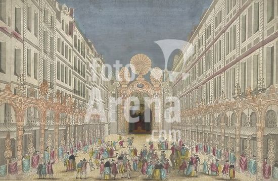 alb15528871 France, Paris, Daumont, Jean-François, View of the decoration of the Rue de la Feronnerie in Paris on the occasion of the restoration of Louis XV, King of France, in 1745, print, prent, opticaprent, prints, prenten, opticaprenten, height 295 mm, width 435 mm, Publication (Event), Publicatie, Frans - 1775, publisher, uitgever, 1745 - 1775, paper, papier, cardboard, kaart, prepared paper, geprepareerd papier, watercolor (paint), waterverf, deck paint, dekverf, etching, brush, Borstel, cutting, haken, perforating, perforateren, print maker, prentmaker.