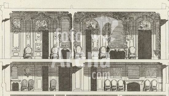 alb15538112 Louis XV (king of France), Paris, Huquier, Gabriel, Meissonnier, Juste Aurèle, Oeuvre de Juste Aurele Meissonnier, Maison de m. Léon Brethous a Bayonne, plans, élévations et coupes, Developement de l'entresol et du premier etage, Cross-section of the mezzanine and first floor of the house of Léon Berthous in Bayonne, Print from a series of 11 etchings with architectural designs and plans of this house. This print is part of an album., print, album leaf, prints, height 153 mm, width 251 mm, 1693 - 1750-07-31, intermediary draughtsman, after a drawing by, 1738 - 1749, paper, papier, etching, etchings, French, 1695 - 1772-06-11, print maker, printmaker, Publication (Event), Publication, publisher, uitgever, 1710-02-15 - 1774-05-10, verlener van privilege.