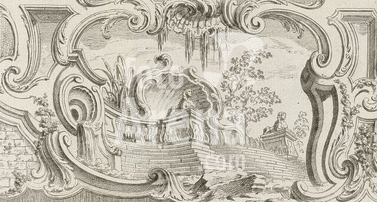 alb15539963 Louis XV (king of France), Paris, Huquier, Gabriel, Meissonnier, Juste Aurèle, Oeuvre de Juste Aurele Meissonnier, Ornament with steps to a terrace on which two sphinxes, This print is part of a album., print, album sheet, ornamental print, prints, height 125 mm, width 220 mm, French, 1695 - 1772-06-11, print maker, printmaker, 1738 - 1749, paper, papier, etching, etchings, Work conception, 1693 - 1750-07-31, after a design by, Publication (Event), Publication, publisher, uitgeverij, 1710-02-15 - 1774-05-10, granter of privilege.