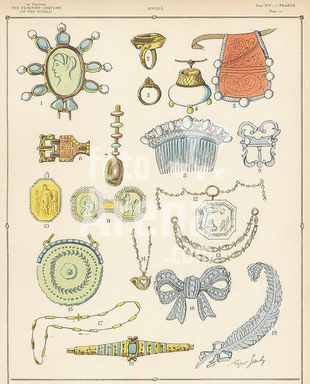 alb18720913 French women's jewelry. Charlemagne's casket 1, 11th century bishop's ring 2, sacerdotal ring 3, 15th century alms bags 4,5, Merovingian buckle 6, Charlotte de Rostang's ear drops 7, 13thC steel comb 8, Louix XV buckle 9, belt plate 10, Marie Antoinette belt plate 11, Consulate chains 12,13,14,17, Restoration bag 15, Second Empire brooch 16, diamond feather 1867 18 and gold bracelet 19. Hand-coloured pochoir (stencil) lithograph by Roger Scuty from Paul Louis de Giafferri's History of Feminine Costume of the World, Foreign Publications, New York, 1927.