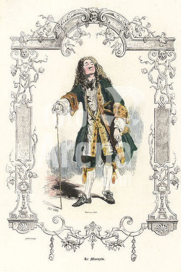 alb18722072 Costume of a marquis, reign of Louis XV, 18th century. In court dress of green justaucorps and breeches, white and gold waistcoat, garters, with cane and tricorne. Le Marquis. Handcoloured steel engraving by Eugene Pred'homme after an illustration by Paul Gavarni, within a decorative border by Bertrand, from Augustin Challamel's Autrefois ou Le Bon Vieux Temps, Types de 18e Siecle, Challamel et Cie, 1842.