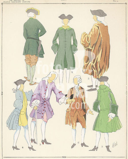 alb18731044 Men's coats of the era of Louis XV of France. Huntsman's costume 1, green frock coat 2,7, frock coat worn by blind persons of the Quinze-Vingts 3, country costume 4, Antoine Watteau 5, and Paris burgher's town habit 6. Hand-coloured pochoir (stencil) lithograph by Hébé from Paul Louis de Giafferri's History of French Masculine Costume from 420 to 1870, Foreign Publications, New York, 1927.
