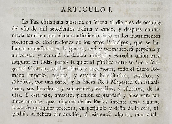 alb5432896 Accession by King Philip V of Spain to the Treaty of Vienna (18 November 1738) between Emperor Charles VI of Germany and Louis XV of France to end the War of the Polish Succession (1733-1735). Spain acceded the following year, signing at Versailles on 21 April 1739. It was ratified by King Philip V at Aranjuez the following 13 May. Article I. Collection of the Treaties of Peace, Alliance, Commerce adjusted by the Crown of Spain with the Foreign Powers (Colección de los Tratados de Paz, Alianza, Comercio ajustados por la Corona de España con las Potencias Extranjeras). Volume II. Madrid, 1800. Historical Military Library of Barcelona, Catalonia, Spain.