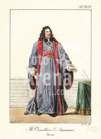 alb9873221 Henri François d'Aguesseau, 1668-1751, Chancellor of France three times between 1717 and 1750 during the Regency of Philippe II, Duke of Orleans, and later under King Louis XV. Le Chancelier d'Aguesseau. Regence. Handcoloured lithograph by Lorenzo Bianchi and Domenico Cuciniello after Hippolyte Lecomte from Costumi civili e militari della monarchia francese dal 1200 al 1820, Naples, 1825. Italian edition of Lecomtes Civilian and military costumes of the French monarchy from 1200 to 1820.