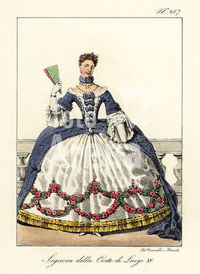 alb9878572 Costume of a noble woman at the court of King Louis XV, mid-18th century. Formal gown, bodice with ribbons and lace, pannier hoopskirt decorated with flowers. Dame de la Cour de Louis XV. Handcoloured lithograph by Lorenzo Bianchi and Domenico Cuciniello after Hippolyte Lecomte from Costumi civili e militari della monarchia francese dal 1200 al 1820, Naples, 1825. Italian edition of Lecomtes Civilian and military costumes of the French monarchy from 1200 to 1820.