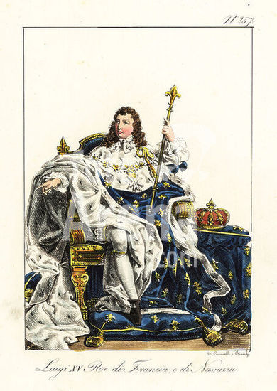 alb9882567 King Louis XV of France, 1710-1774, Louis the Beloved, on his throne with crown, scepter, ermine robes with fleurs-de-lys armorial motif. Louis XV, Roi de France et de Navarre. Handcoloured lithograph by Lorenzo Bianchi and Domenico Cuciniello after Hippolyte Lecomte from Costumi civili e militari della monarchia francese dal 1200 al 1820, Naples, 1825. Italian edition of Lecomtes Civilian and military costumes of the French monarchy from 1200 to 1820.