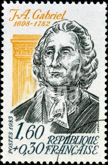 917_28_WHA_113_0100 French postage stamp commemorating J Gabriel 1698-1782. principal architect of King Louis XV of France. His major works included the Place de la Concorde, the Ecole Militaire, and the Petit Triannon and opera theatre at the Palace of Versailles.