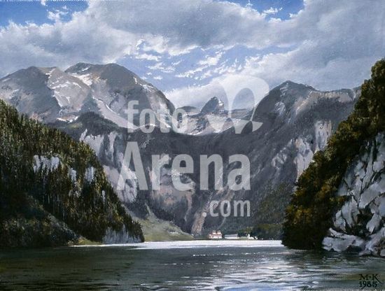akg677397 Königssee (Berchtesgadener Alpen, Bayern).-"Der Königssee".-Gemälde, 1985, von Matthias Koeppel (geb.1937). Aus der Zyklus: Deutsche Landschaften. Öl auf Leinwand, 30 x 40 cm. Museum: Private Collection., Privatsammlung.