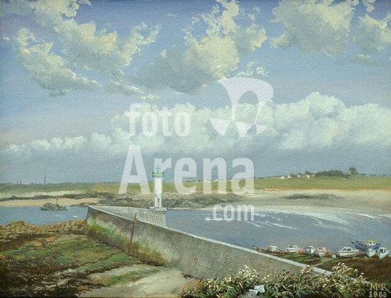 akg677285 Moguériec (Dép.Finistère, Bretagne, Frankreich), Leuchtturm.-"Die Kaimauer von Moguériec (Bretagne)".-Gemälde, 1988, von Matthias Koeppel (geb. 1937). Öl auf Leinwand, 30 x 40 cm. Museum: Private Collection., Privatsammlung.
