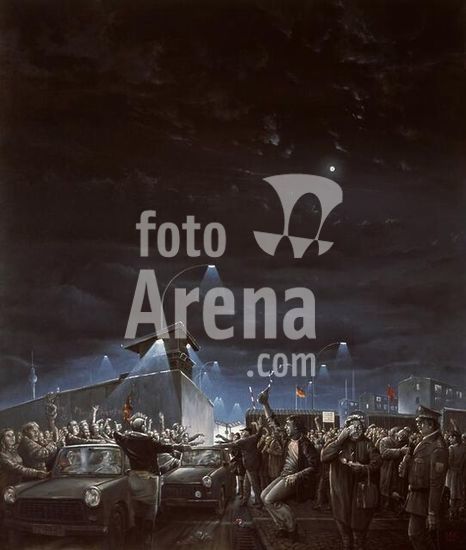 akg994545 Berlin, Nacht vom 9./10. November 1989: Öffnung der DDR-Grenzen nach Westen.-"Die Öffnung der Berliner Mauer" (Mittelteil, Ausschnitt).-Gemälde, 1996/97, von Matthias Koeppel (geb.1937). Mittelteil des Triptychons. Öl auf Leinwand, Mittelteil 400 x 440 cm. Berlin, Berliner Abgeordnetenhaus.