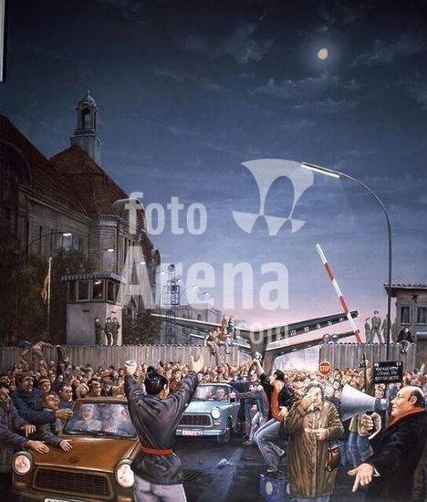 akg994542 Berlin, Nacht vom 9./10. November 1989: Öffnung der DDR-Grenzen nach Westen.-"Die Öffnung der Berliner Mauer" (Rechter Teil, Ausschnitt).-Gemälde, 1996/97, von Matthias Koeppel (geb.1937). Rechter Teil des Triptychons. Öl auf Leinwand, Seitenteile je 320 x 220 cm. Berlin, Berliner Abgeordnetenhaus.