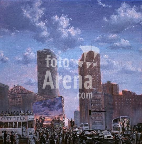 akg677444 Berlin-Charlottenburg, Kurfürstendamm.-"Die Jahrhundertfeiern (Großes Kurfürstendamm-Triptychon)".-Rechter Teil (Der Kurfürstendamm während der 800-Jahrfeier 2037). Gemälde, 1987, von Matthias Koeppel (geb. 1937). Gesamtmaße 3 x 6 m, Teile je 3 x 2 m. Museum: Haus am Checkpoint Charlie., BERLIN.
