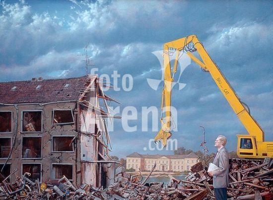 akg416552 Koeppel, Matthias geb. 1937. "Die Freilegung des Schlosses Neuhardenberg", 2000. Öl auf Leinwand, 100 × 135 cm. Privatsammlung. Museum: PRIVATE COLLECTION. Copyright: © Matthias Koeppel. This artwork is not in the public domain. It is your responsibility to obtain all necessary third party permissions from the copyright handler in your country prior to publication.
