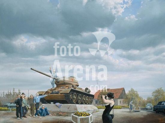 akg424341 Koeppel, Matthias. geb. 1937. "Gruppenbild in Kienitz (Auf der Straße der Befreiung) ", 1995. (Dargestellt sind die Mitglieder der Künstlergruppe "Maler vor Ort"). Öl auf Leinwand, 120 × 160 cm. Berlin, Haus am Checkpoint Charlie. Museum: Berlin, Haus am Checkpoint Charlie. Copyright: © Matthias Koeppel. For editorial use only. This artwork is not in the public domain. It is your responsibility to obtain all necessary third party permissions from the copyright handler in your country prior to publication.