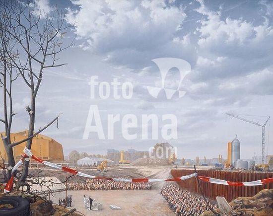 akg424348 Berlin-Tiergarten, chantier du projet debis - Potsdamer Platz (Daimler-Chrysler InterServices Gmbh ; arch. : Renzo Piano). "Pose de la première pierre sur la Potsdamer Platz". (29 octobre 1994). Huile sur toile, 1995, de Matthiäs Koeppel. (né en 1937), 150 × 190 cm. Prêt permanent Ronnie Golz, Berlin, SMB, Staatsbibliothek zu Berlin. Museum: Berlin, SMB, Staatsbibliothek zu Berlin. Copyright: © Matthias Koeppel. This artwork is not in the public domain. It is your responsibility to obtain all necessary third party permissions from the copyright handler in your country prior to publication.