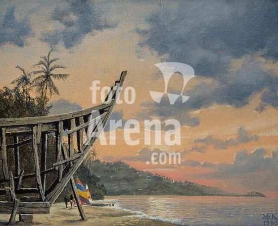 akg461276 Koeppel, Matthias. geb. 1937. "Grenada: Coca-Buda am Grand-Anse-Strand (Karibik) ", 1990. Öl auf Leinwand, 24 × 30 cm. Privatsammlung. Museum: PRIVATE COLLECTION. Copyright: This artwork is not in the public domain. It is your responsibility to obtain all necessary third party permissions from the copyright handler in your country prior to publication. © Matthias Koeppel.
