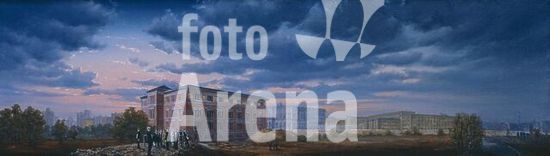 akg677466 Koeppel, Matthias; geb.1937. "Die Sacrower Heilandskirche an der Havel", 1987. Ausschnitt: Rechter Teil. Wandbild, Öl auf Leinwand, Gesamtmaße 2,85 x 10 m. Berlin, Rathaus Schöneberg, Goldener Saal.