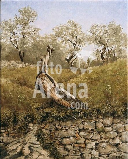 akg677290 Koeppel, Matthias; geb. 1937. "Toter Olivenbaum vor Casa Nuova (Toskana)", 1988. Öl auf Leinwand, 50 x 70 cm. Museum: Private Collection., Privatsammlung.