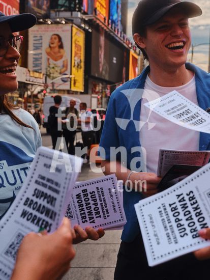 Meghan Guastella, left, and Micki Hardenberg, members of ActorsÕ Equity Association, distribute informational fliers in Midtown Manhattan on Tuesday, Oct. 7, 2025. Broadway is facing a possible strike this fall as two of its major labor unions Ñ the one representing actors and stage managers and the one representing musicians Ñ are simultaneously in negotiations for new contracts with the industryÕs commercial producers. (Ye Fan/The New York Times/Fotoarena)