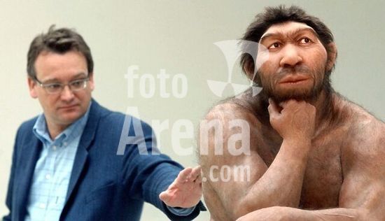 dpa7365699 (dpa) - Harald Meller, the director of the museum, gently touches the prehistoric man sitting in the 'Thinker'-pose in the prehistory museum in Halle/Saale, eastern Germany, 17 April 2003. The Neanderthal figure made by the Studio Daynes in Paris is modeled on 250,000 years old skeleton remains.