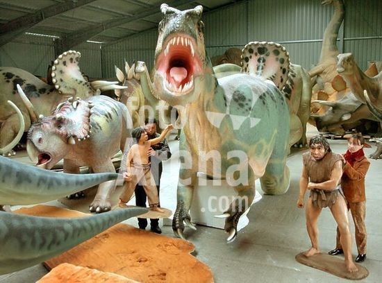 dpa7375859 (dpa) - Two employees move the figures of stone age people standing next to a life-size dinosaur model in the hall of a large-size sculpture company in Loccum, Germany, 19 November 2004. The company has specialised in manufacturing replications of prehistoric animals which are sold or rented to museums and exhibitions worldwide. The light sculptures are made of plastic and easy to carry or to move.