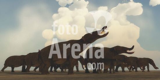 alb3876970 A Platybelodon herd gathers on the plains of Africa to migrate to a better grazing area in the Miocene epoch.
