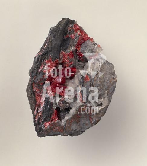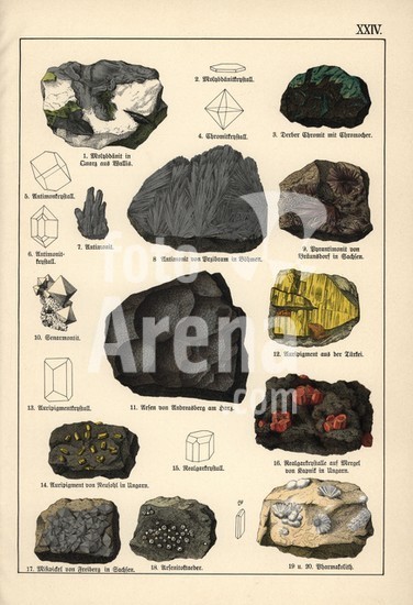 Metals including molybdenite in quartz, dirty chromite with oxide of chrome, antimonite, pyrantimonite, arsenic, orpiment, realgar crystal, arsenite octahedrons and pharmakolite. Chromolithograph from Dr. Aldolph Kenngott's "Mineralogy" section in Gotthilf Heinrich von Schubert's "Naturgeschichte," Schreiber, Munich, 1886.