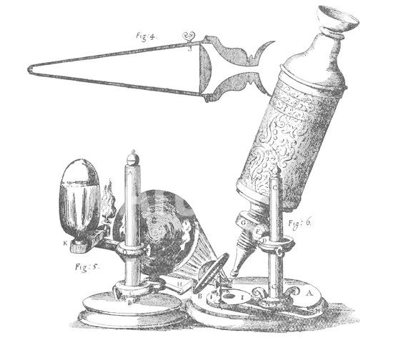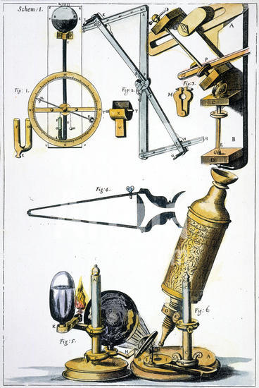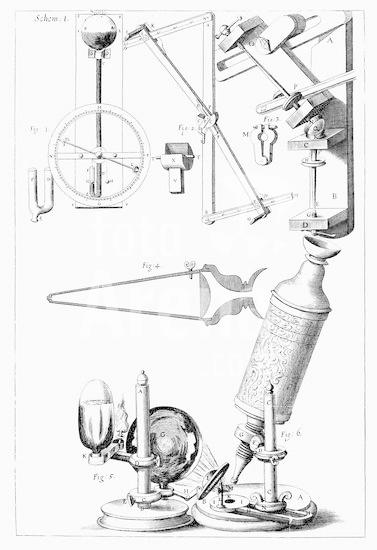 917_05_0460001483 Hooke's microscope with condenser for concentrating light: left to right above are his Barometer, Refractometer for measuring refractive power of liquids, and lens-grinding machine. From Robert Hooke Micrographia London 1665. Engraving.