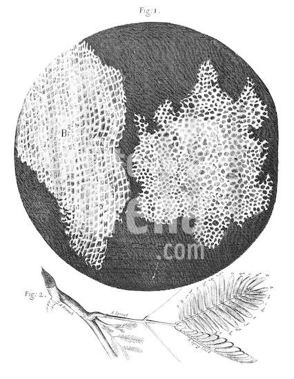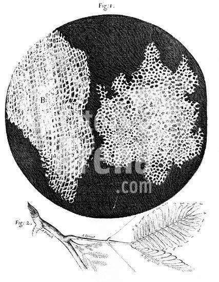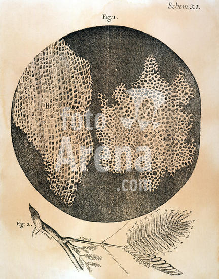 917_05_0460001484 Hooke's observations of cellular structure of cork (fig 1) and sprig of Sensible (Sensitive) plant (fig 2). First use of word cell to name honeycomb nature of cork. From Robert Hooke Micrographia London 1665. Engraving.