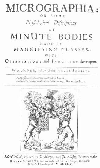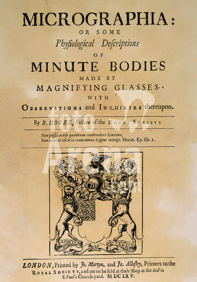 0033731 HOOKE'S MICROGRAPHIA. Title-page of the first edition of Robert Hooke's 'Micrographia,' London, 1665, an early landmark in microscopy containing the first illustration of cells.