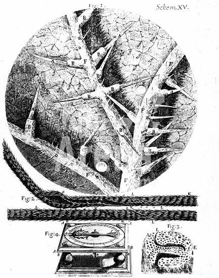917_05_0460001481 1: Underside of stinging nettle leaf 2: Beard of wild oat used in Hooke's hygrometer. 3: Section of head of wild oat. 4: Hooke's hygrometer. From Robert Hooke Micrographia London 1665. Engraving .